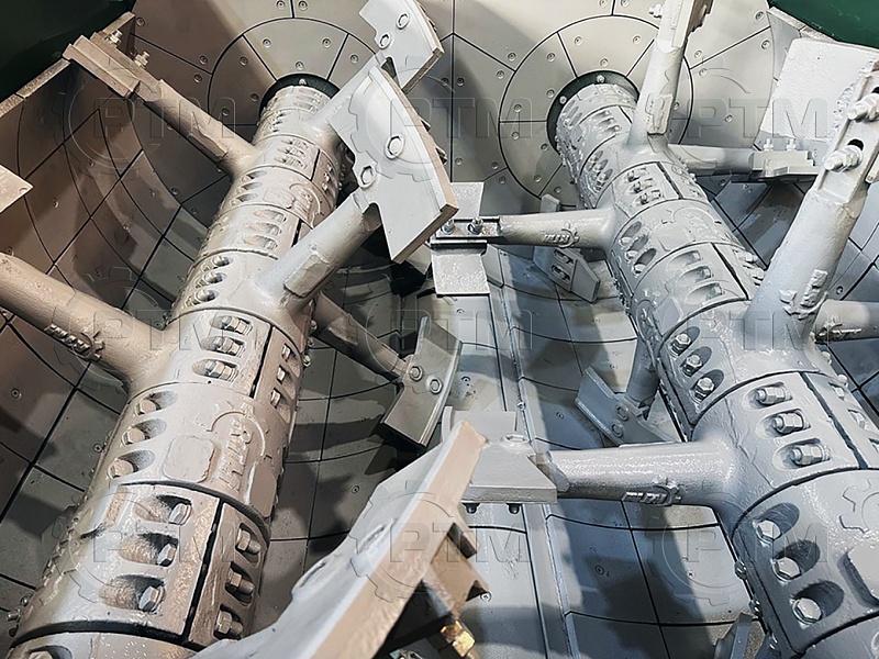 2. Валы и лопасти: вращающиеся валы движутся в противоположных направлениях, создавая силы смешивания. На валах установлены стойки с лопастями, которые перемещают материалы в разные направления и обеспечивают равномерное смешивание. Стойки и лопасти выполнены из высокопрочного износостойкого чугуна, срок эксплуатации два года.