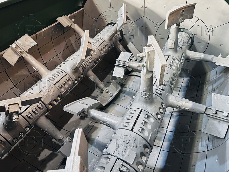 2. Валы и лопасти: вращающиеся валы движутся в противоположных направлениях, создавая силы смешивания. На валах установлены стойки с лопастями, которые перемещают материалы в разные направления и обеспечивают равномерное смешивание. Стойки и лопасти выполнены из высокопрочного износостойкого чугуна, срок эксплуатации два года.