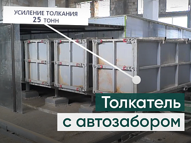 Толкатель электромеханический имеет жесткий каркас из швеллера 8П, конструкция крепится анкерами к бетонному полу. Имеется тележка, которая выполняет толкающую функцию. Перемещение тележки происходит при помощи червячного мотор- редуктора. Толкатель облегчает процесс работы на газобетонном заводе, перемещает конвейерные основания с массивами газобетона. Толкатель имеет функцию забора конвейерного основания с передаточной тележки. Тележка толкателя имеет ход вперед и назад. При включении толкатель захватывает конвейерное основание проталкивает на определенное расстояние, после нажатия концевого выключателя, включается обратный реверс и толкающая тележка возвращается в исходное положение.