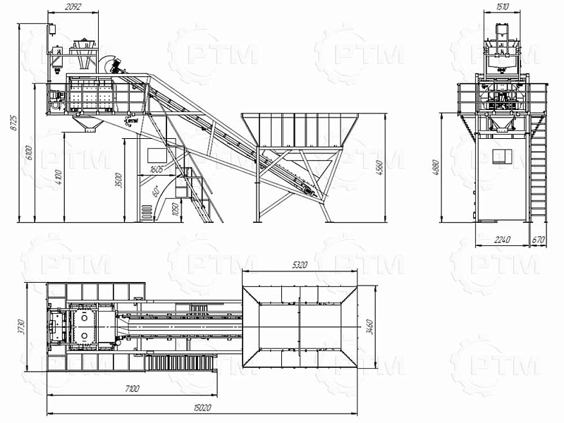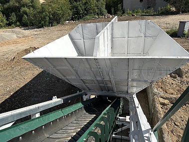 1. Дозирующий комплекс ДРКМ-40 (4 секции по 10 м3): состоит из двух до четырех бункеров для хранения инертных материалов (щебень, песок, отсев). На каждом бункере имеется два пневмо- затвора, необходимых для точной дозации материалов. При дозировании материалы попадают на весовой ленточный конвейер, весовые датчики фирмы CAS Ю. Корея, при наборе нужного количества материалов, заслонки закрываются, подача прекращается. Каждый бункер оснащен вибродвигателем MVE 300/3.
