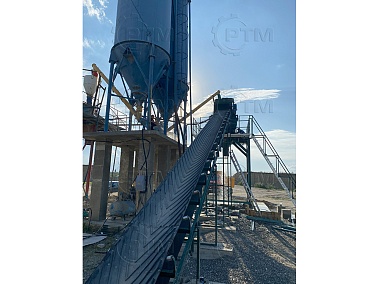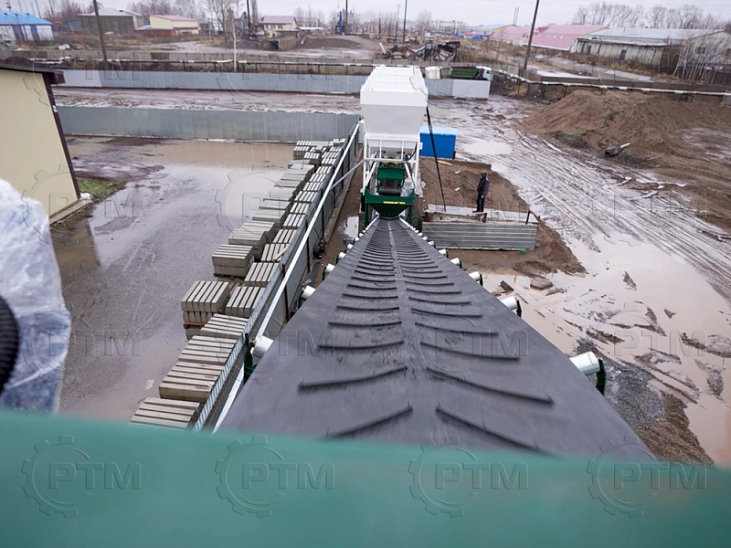 2. После набора нужного количества материалов инертные попадают на наклонный ленточный конвейер с шевронной лентой. Ширина ленты 600 мм, длинна конвейера 16 метров.