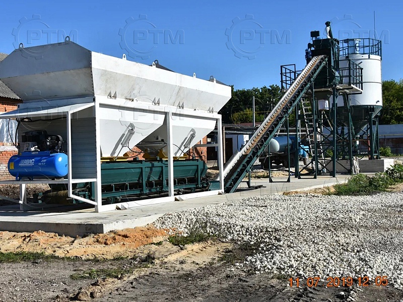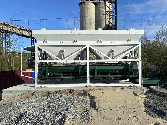 1. Дозирующий комплекс СТ-20 (2 секции по 10 м3): состоит из двух до четырех бункеров для хранения инертных материалов (щебень, песок, отсев). На каждом бункере имеется два пневмо- затвора, необходимых для точной дозации материалов. При дозировании материалы попадают на весовой ленточный конвейер, весовые датчики фирмы CAS Ю.Корея, при наборе нужного количества материалов, заслонки закрываются, подача прекращается. Объем каждого бункера от 2,5 м3 до 20 м3, в зависимости от комплектации завода. Каждый бункер оснащен вибродвигателем MVE 300/3.
