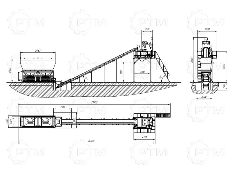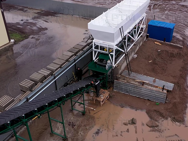 2. После набора нужного количества материалов инертные попадают на наклонный ленточный конвейер с шевронной лентой. Ширина ленты 600 мм, длинна конвейера 16 метров.