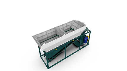 1. Дозирующий комплекс МБ-24 (2 секции по 12 м3): состоит из двух до четырех бункеров для хранения инертных материалов (щебень, песок, отсев). На каждом бункере имеется два пневмо- затвора, необходимых для точной дозации материалов. При дозировании материалы попадают на весовой ленточный конвейер, весовые датчики фирмы CAS Ю.Корея, при наборе нужного количества материалов, заслонки закрываются, подача прекращается. Объем каждого бункера от 2,5 м3 до 20 м3, в зависимости от комплектации завода. Каждый бункер оснащен вибродвигателем MVE 300/3.