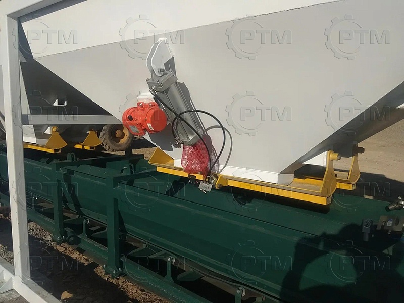 1. Дозирующий комплекс МБ-24 (2 секции по 12 м3): состоит из двух до четырех бункеров для хранения инертных материалов (щебень, песок, отсев). На каждом бункере имеется два пневмо- затвора, необходимых для точной дозации материалов. При дозировании материалы попадают на весовой ленточный конвейер, весовые датчики фирмы CAS Ю.Корея, при наборе нужного количества материалов, заслонки закрываются, подача прекращается. Объем каждого бункера от 2,5 м3 до 20 м3, в зависимости от комплектации завода. Каждый бункер оснащен вибродвигателем MVE 300/3.