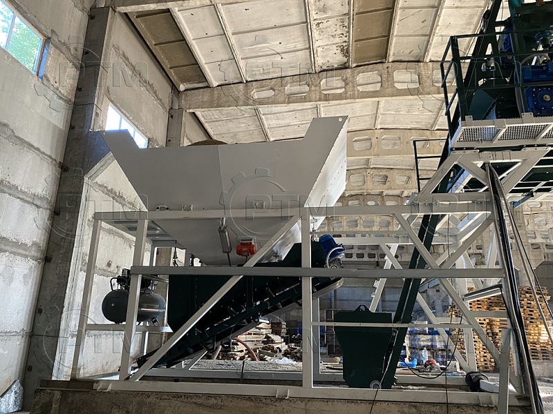 1. Дозирующий комплекс МБ-8 (2 секции по 4 м3): состоит из двух до четырех бункеров для хранения инертных материалов (щебень, песок, отсев). На каждом бункере имеется два пневмо- затвора, необходимых для точной дозации материалов. При дозировании материалы попадают на весовой ленточный конвейер, весовые датчики фирмы CAS Ю.Корея, при наборе нужного количества материалов, заслонки закрываются, подача прекращается. Объем каждого бункера от 2,5 м3 до 20 м3, в зависимости от комплектации завода. Каждый бункер оснащен вибродвигателем MVE 300/3.