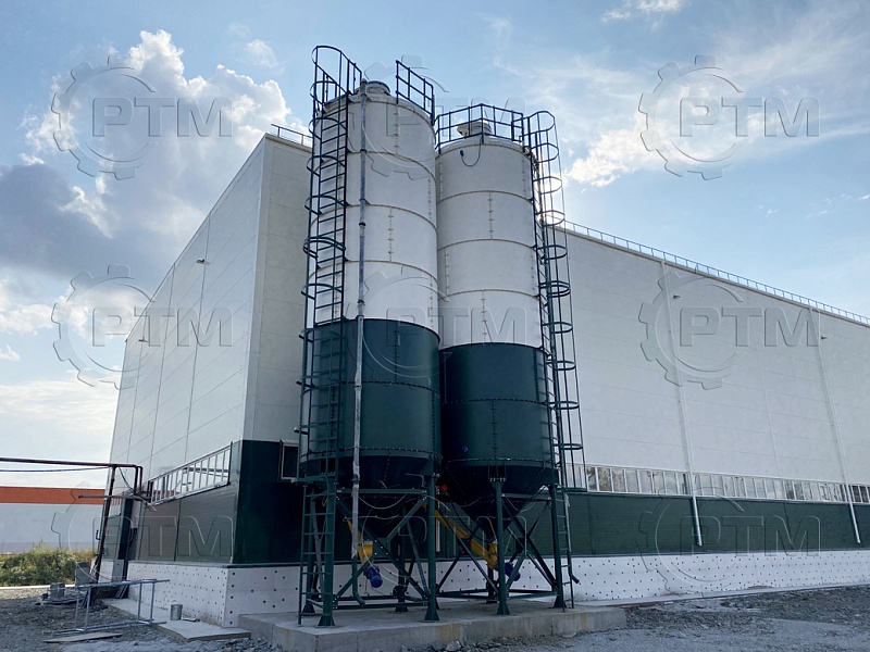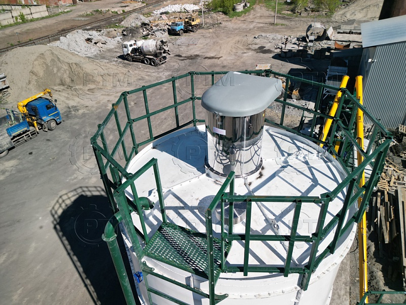 Силос выполнен из цилиндрической банки и конуса, что обеспечивает естественное движение цемента. Он имеет закрытую верхнюю часть для защиты материала от неблагоприятных погодных условий.