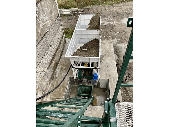 2. После набора нужного количества материалов инертные попадают в скиповый бак, далее скиповый бак поднимается и высыпает материалы в бетоносмеситель.