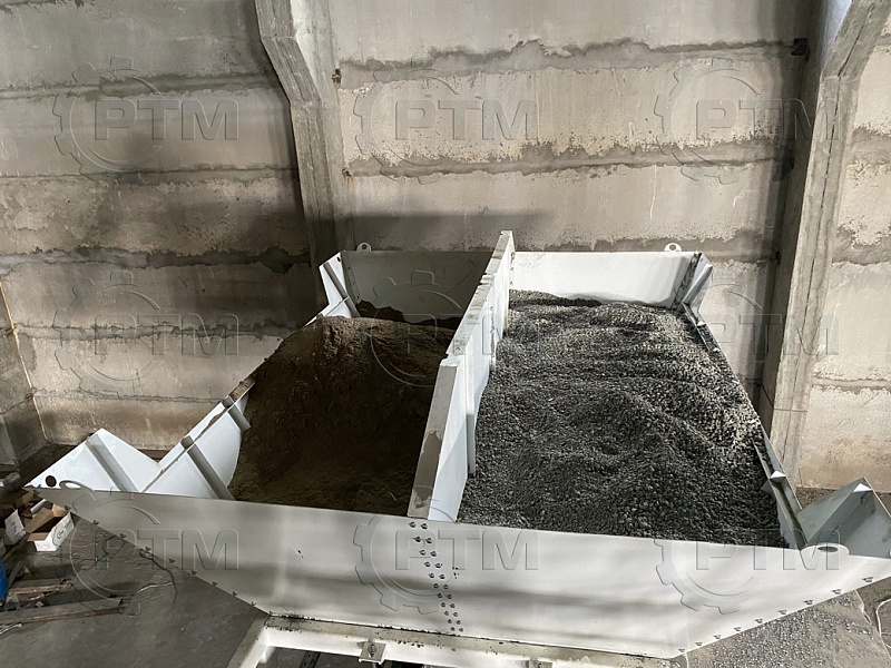 1. Дозирующий комплекс СТЭ-8 (2 секции по 4 м3): состоит из двух до четырех бункеров для хранения инертных материалов (щебень, песок, отсев). На каждом бункере имеется два пневмо- затвора, необходимых для точной дозации материалов. При дозировании материалы попадают на весовой ленточный конвейер, весовые датчики фирмы CAS Ю.Корея, при наборе нужного количества материалов, заслонки закрываются, подача прекращается. Объем каждого бункера от 2,5 м3 до 20 м3, в зависимости от комплектации завода. Каждый бункер оснащен вибродвигателем MVE 300/3.