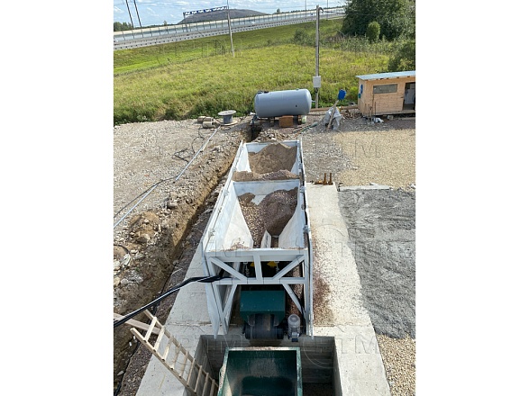 2. После набора нужного количества материалов инертные попадают в скиповый бак, далее скиповый бак поднимается и высыпает материалы в бетоносмеситель.